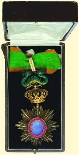 Commander's Decoration; neck badge, silver gilt, brilliant cut, centre medallion enamelled, with crown and enamelled dragon above, French hallmarked and maker's mark, reverse blank, suspension loop and short piece of ribbon, with box (Arthur BERTRAND, Paris). Excellent design and quality, tiny enamel damage in centre. Very attractive!