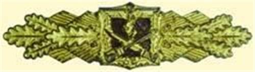 Close Combat Clasp in Gold; Breast badge, zinc bronzed and later on with metallic colour gilded, slightly vaulted, reverse wide tapered pin (tombak), maker's mark "…PEEKHAUS/ BERLIN…GABLONZ"; with original iron plate in centre (a bit corroded). Original Bronze Close Combat-Clasp, which was used as a "Gold-Clasp"; anyway an original clasp from WW II !