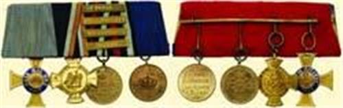 Old Prussian Style Order's Clasp: Order of the Crown 4th Class - 1st Type (bronze gilt, partially enamelled, small crown, swords removed, some enamel damage); Commemoration Cross "Königgrätz" 1866 (bronze gilt); War Medal 1870/1871 (bronze with inscription on rim, with ribbon bars "PARIS, MONT VALERIEN, WEISSENBURG, WÖRTH"); Landwehr Medal 2nd Class (1913; bronze); signs of wearing, ribbon bar with some repair.