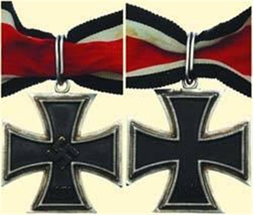 Knight's Cross of the Iron Cross 1939; neck badge, white metal frame silver plated, core of brass black lacquered, high relief swastica with precise edges, maker's mark on reverse has been removed (officially?), with original ring, but later suspension loop and original worn ribbon. Typical knight's cross of Steinhauer&Lück before 1945 for private purchase. Signs of age and wearing, fine old collector's item of high interest!