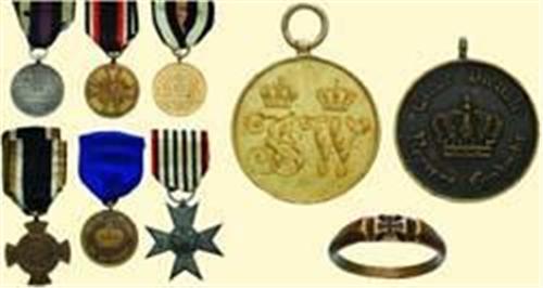 Commem. Cross "KÖNIGGRÄTZ" 1866; War Medal for Combattants 1870/1871 with inscription on rim; War Medal for Non-Combattants 1870/1871 (iron); Hohenzollern Commem. Medal 1848/49; Long Service Medal XII; Landwehr Long Service Medal 2nd class; Cross for War Assistance Service (base metal); patriotic ring / WWI.; Denmark Medal 1864 - Austrian type (bronze, without inscription on ring). Mostly with ribbons.