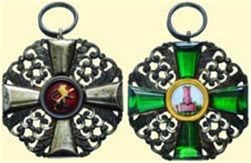 Knight's Cross 2nd Class; breast badge, silver, with arms of green glas and painted centre medallion, frame of centre gold, reverse with enamelled and gilt medallion; with original suspension ring. Fine old patina!