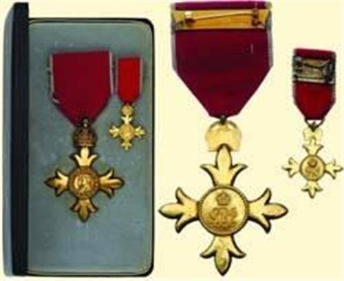 Breast Badge 4th Class - 2nd Type / Civil (O.B.E.); breast badge, silver gilt, with original ribbon (2nd type / civil) with pin on reverse; together with miniature badge (23 x 29 mm, silver gilt, with ribbon and pin) in original box of issue (Royal Mint) and instructions card as to wearing Insignia.