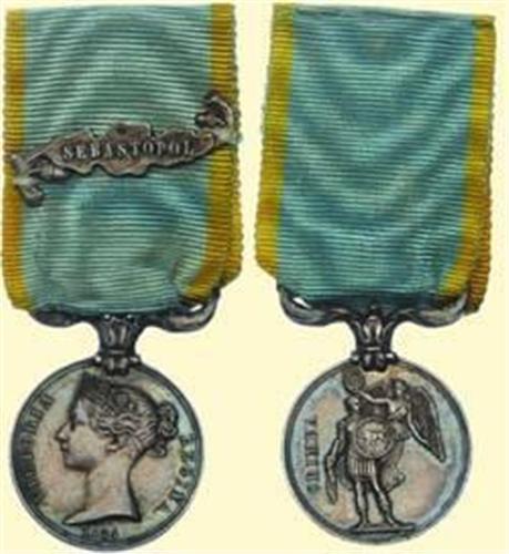 Crimea Medal 1854; half size reduction medal, silver, diam.: 22,9 mm, with fixed ornamental suspension, original old ribbon with "SEBASTOPOL"-clasp, with French hallmark. Nice old patina! Excellent quality and near best condition!