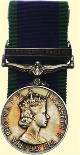 Silver, named "24185604 GDSM. R. McWHITE SG." (Guardsman of the Scots Guards) with ornamental suspension bar and "NORTHERN IRELAND"-clasp, mounted as worn. Small signs of wearing.