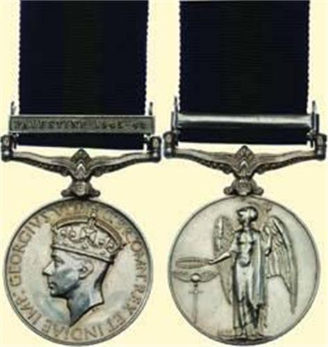 General Service Medal - George VI / 1st Type; silver, "Georgius VI...Indiae Imp" (1937-49), named "14464648 PTE. A. LAKEY. R. WARWICK.", with ornamental suspension bar with "PALESTINE 1945-48"-clasp and original ribbon. Small signs of wearing and cleaning.