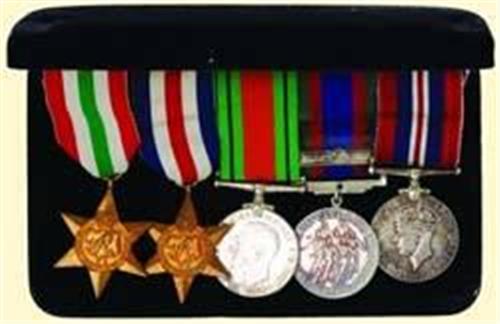 Group of Five; Italy Star, France and Germany Star, Defence Medal (white metal), Canadian Volunteer Service Medal 1939-1945 (silver) with Maple Leaf clasp, War Medal 1939-1945 (silver plated); with original ribbons fixed to plastic bar, in black velvet box in paper cover.