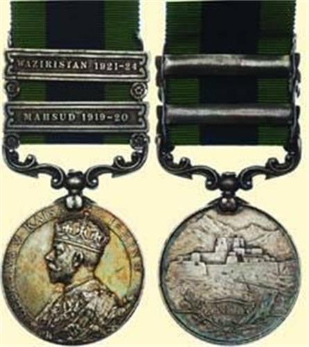 India General Service Medal 1909 (1910-30) - Type II (George V Kaisar-i-Hind); silver, named "CARPTR. MOHD. BAKHSH. 112 P. BTY.", with ornamental swivel suspension, ornate claw and two clasps "MAHSUD 1919-20, WAZIRISTAN 1921-24", with ribbon. Signs of contact and edge bruising.