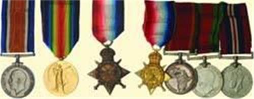 Lot of Seven (two Personal Groups); Trio: 1914-15 Star, British War and Victory Medals / WW I (named "M2 - 047917 PTE (A. CPL.) C. J. G. WATSON. A. S. C."), separate medals, with original ribbons, small damaged named cardboard box. Group of Four: 1914-Star (cast bronze gilt, private production), Africa Service Medal 1943, Defence and War Medals 1939-1945, named (the medals): "C 322833 W. JANSEN"; mounted for wearing.