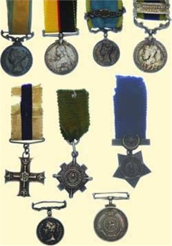 Lot of Ten; Military Cross / GRV, Baltic Medal 1856, Crimea Medal 1854 (2, one with SEBASTOPOLclasp, one with French hallmark), Khedive's Star 1882 with star and crescent clasp, Queen's Sudan Medal 1899, India General Service Medal - George V (KAISAR-I-HIND) with two clasps ("AFGHANISTAN N. W. F. 1919, NORTH WEST FRONTIER 1935"), Volunteer Long Service and Good Conduct Medal - Victoria Regina, Ceylon Inauguration Armed Services - Medal, 5. Vol. Batt. / The Royal Scotts - named "1904". Partially with old ribbons.