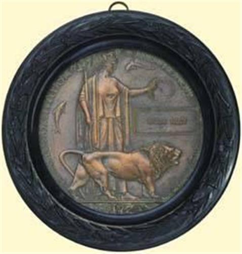 Memorial Plaque 1919; large bronze medal (Willie Riley), black circular wooden frame with laurel wreath. Fine exact cast quality!