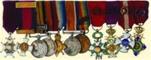 Mounted Group of Eleven; Order of the Bath (Military), silver gilt and enamels; Distinguished Service Order, GVR, gold, enamels and two gold bars; East and West Africa Medal with "WITU 1890"-clasp; Queen's South Africa Medal; 1914 Star; War and Victory Medals / WW I; French Legion of Honour - Officer 1870; Belgian Order of Leopold with Swords - Officer; Italian Order of the Crown - Officer; Romanian Order of the Star, 1st type - Officer with Swords, the last four silver gilt and enamels; with ribbons mounted for wearing. High quality miniature group of a very well decorated British officer shortly after 1st world war! Small enamel damage on Legion of Honour and Italian Crown.