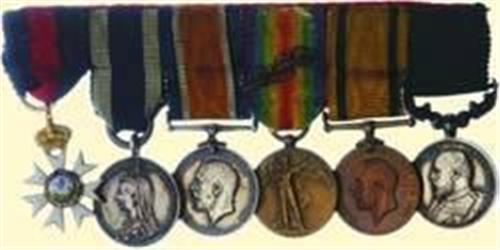 Mounted Group of Six; Order of St. Michael and St. George, gold and enamels; Jubilee Medal 1887, silver; British War and Victory Medals with one palm branch; Territorial Force War Medal 1919, bronze; Army Long Service and Good Conduct Medal - Edward VII, silver. With ribbons mounted for wearing. Signs of wearing!