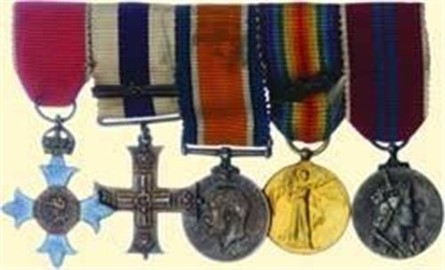 Mounted Group of Five; Order of the British Empire, badge 2nd type, silver gilt and obverse enamelled, civil ribbon 2nd type; Military Cross - GVR with one clasp, silver; British War and Victory Medals / WW I with one palm branch; Coronation Medal 1953 (E. II), silver. With ribbons mounted for wearing. Fine quality with some patina!