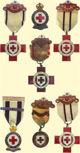 Lot of Seven; breast crosses (4) with ribbon buckles (for "NURSING, FIRST AID, WORK"); breast medals ("FIRST AID 1913, 3 YEARS SERVICE"); pin badge ("FOR SERVICE"). All bronze gilt, obverse enamelled, partially named and/or numbered, 6 with original ribbons with enamelled pin buckles. Very attractive!