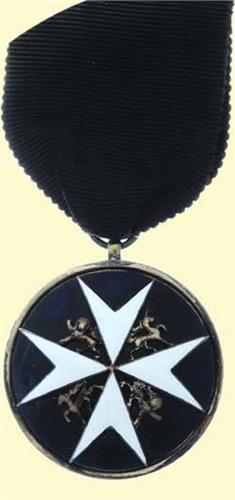 Serving Brother's Badge; breast badge, silver circular medallion, obverse black enamelled, superimposed white enamelled order's badge; reverse blank, hollow version with ring suspension and black breast ribbon with pin. Small enamel damage in black background.