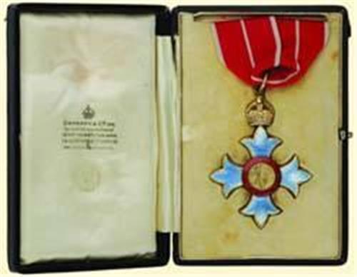 Commander's Cross - 1st Type / Military (C.B.E.); neck badge, silver gilt, obverse enamelled, with crown, suspension ring and short piece of military ribbon (2nd type). With original box of issue (GARRARD&Co. Ltd....London) and instructions card as to wearing Insignia. Some enamel damages on the surface of three arms.