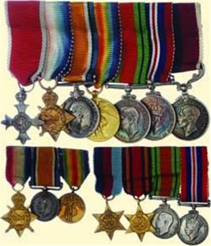 Three different Groups with altogether Fourteen; 1) Seven: Order of the British Empire - 2nd type Member (MBE), civil, silver; 1914-15 Star, British War and Victory Medals / WW I; Defence and War Medal / WW II; Royal Air Force Long Service and Good Conduct Medal / George VI (...IND. IMP.); 2) War Trio: 1914-1915 Star, British War and Victory Medals / WW I; 3) Four 1939-1945 and Burma Stars, Defence and War Medals / WW II. All mounted for wearing, some patina and signs of wearing!