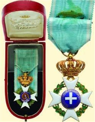 Officer's Cross - 2nd type; breast badge, gold enamelled, with enamel painted medallion on obverse, with crown, suspension ring and original ribbon (partially glued together), in original box of "G.Pomonis...Athenes". Excellent fine old jeweller's quality in best condition!