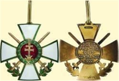 Commander's Cross with War Decoration and Swords; neck badge, silver gilt, obverse enamelled, with laurel wreath and crossed swords, arched cross with later mounted suspension loop, reverse with motto-medallion (SI DEUS PRO NOBIS...1922). Small signs of wearing on obverse, significant manipulation on reverse. This rare decoration was changed from an original Officer's pin badge to a neck badge by mounting a suspension loop and removing pin and hook. Very interesting specimen from the end of WW II or exile.