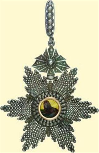 Commander's Decoration; neck badge, silver brilliant cut, centre medallion gold and painted enamel, with ornament above and brilliant cut suspension loop; old Russian hallmark on reverse ("84 St. Petersburg", maker's mark "DO" in cyrillic letters, Soviet "916" mark on suspension). Very fine and unusual version with small signs of wearing!