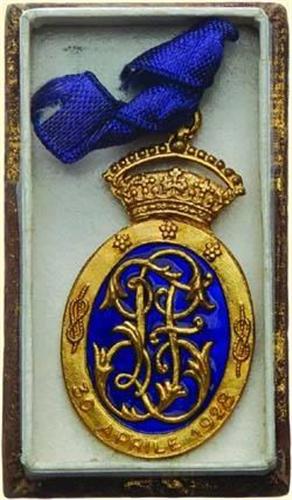 Small breast badge with cypher "LF" and crown, bronze gilt, obverse partially enamelled, reverse blank, with tiny blue ribbon and blue cardboard box. Very fine design and condition, one small testing mark.