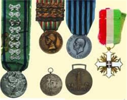 War Medal for the Unity of Italy 1915-1918, bronze with four clasps (1915, 1916, 1917, Albania 1918); Victory Medal 1914-1918, bronze with wide suspension loop; Libia Italiana - Medal, bronze silver plated, named; East Africa - Medal V.E.III, bronze dark patinated; Fascist Union of Families with Many Children Medal, aluminium, with 8 alu-bows for 8 children on ribbon; unofficial Savoya-Cross, bronze gilt, obverse enamelled; four with ribbons.