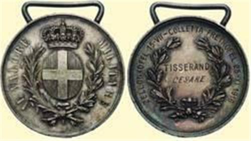 Silver Medal - type WW I; breast badge, silver, with wide wire loop, inscription on reverse: "TISSERAND CESARE / ZELLONKOFEL 15-VII-COLETTA FREIKOFEL 25-XI 1916". Signs of wearing and cleaning! Italian named bravery medals are rare!