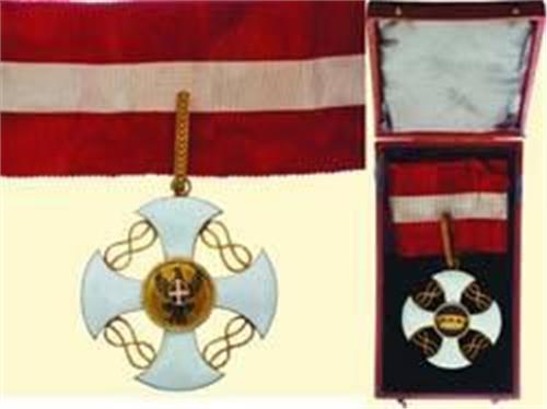 Commander's Cross; neck badge, gold and enamels, with long beaded suspension loop, with original ribbon in original old leather box (VE). Very fine unusual old version!
