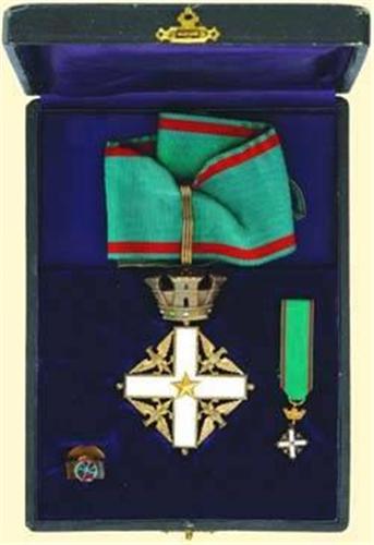 Commander's Cross - Set; Neck Badge, silver gilt, enamelled, with mural - crown - suspension, original suspension loop with hallmark, original ribbon; together with miniature - badge with ribbon and buttonhole - rosette miniature in original box of issue with dealer's label ("A. POZZI, Roma…"). Box with signs of age.