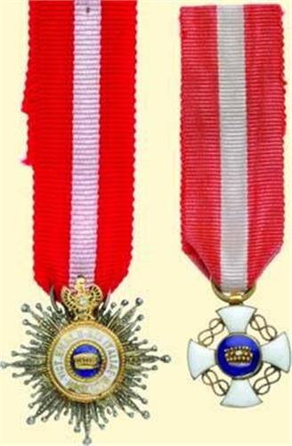 Two Miniatures; 1) Grand Cross Star; silver, gold and enamels, diam.: 22,5 mm, fine modern version with tiny enamel damage. 2) Badge; gold and enamels, diam.: 14 mm; both with ribbons.