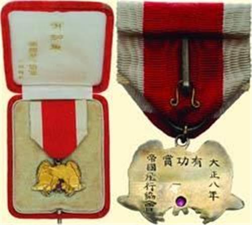 Golden Bagde of Honour; breast badge, silver gilt, with red stone on observe (not tested), reverse blank with Japanese inscription (for exceptional merits). Very attractive and rare!
