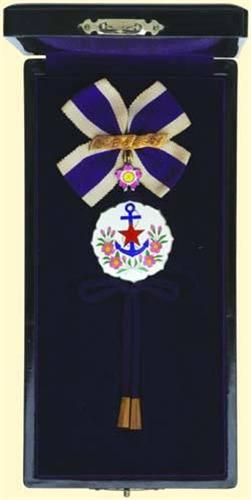 Decoration for Exceptional Zeal; breast decoration, silver gilt, observe multi-coloured enamelled, reverse with Japanese inscription, with small floral suspension and original ribbon bow with pin, with violet ornamental cord. Excellent quality and condition, very attractive!