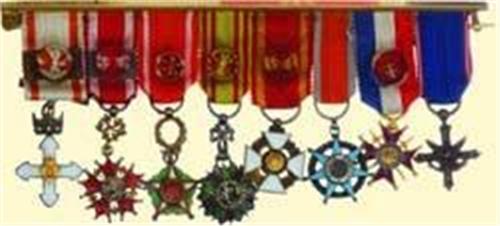 Group of Eight; LITHUANIA: Order of Vytautas the Great - Grand Cross; CZECHOSLOVAKIA: Order of the White Lion - Commander's badge / Civil; MOROCCO: Order of Ouissam Alaouit Cherifien - Officer's badge; TUNIS: Nishan El-Iftikar (Sidi Ahmed) - Officer's badge; FRANCE: Society Order - Officer's badge; Order of Social Merit; French-British Association 1940-44; USA: Distinguished Service Cross; mostly silver enamelled, with ribbons mounted on gilt pin bar. Very attractive miniature group!