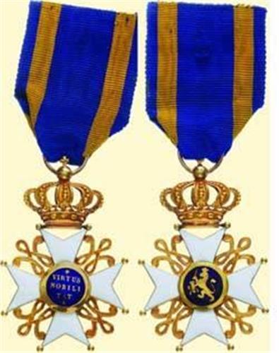 Knight's Cross; breast badge, gold enamelled, with movable crown with hallmarked cross, medallions on both sides with blue enamel, with suspension ring (illegible maker's mark) and original ribbon. Very fine old quality, but signs of glue and small enamel damages.