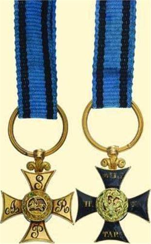 Miniature Badge; Knight's Cross - II. / III. Type; gold, obverse black enamelled, reverse with letters "A-S-R-P" and Lithuanian Pogon coat of arms / 1792; without ballpoints, with large grooved suspension ring and new ribbon. Very old and fine miniature badge of excellent quality but most of enamels in medallions are missing.
