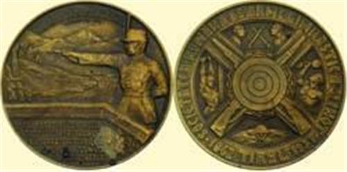 "75TH JUBILEE OF THE ROMANIAN SPORT ORGANIZATION TIRUL". Bronze medal 1937 by F. W. Becker, 60 mm. Obv. Prince Carol shooting at the border pillar, "TINTA MEA E STALPUL DE HOTAR DIN CARPATI - CAROL PRINCIPE MOSTENITOR ELEV AL SCOALEI MILITARE DIN IASI"; below "SOC. OCROTITA DE REGII CAROL I SI FERDINAND I A SARBATORIT JUBILEUL DE 75 ANI IN DOMNIA REGELUI CAROL II". Rv. Two crossed rifles, target, sporting events in field, around "SOCIETATEA ROMANA DE ARME, GIMNASTICA SI INOT · 1862 · TIRUL · 1937". Buz. p. 274 var.