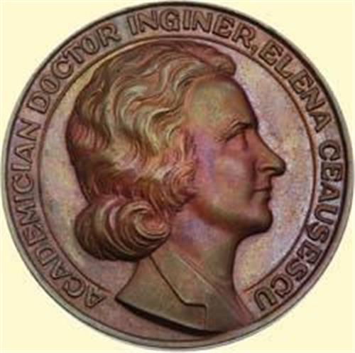 ACADEMICIAN ELENA CEAUSESCU". Bronze uniface medal, 60 mm. Obv. Bust of Elena Ceausescu r., "ACADEMICIAN DOCTOR INGINER ELENA CEAUªESCU". Buz. -