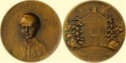 "ACADEMY OF AGRICULTURE". Bronze medal 1928 by S. J., 60 mm. Obv. Bust of Michael I, "MIHAI I REGE AL ROMÂNIEI". Rv. Agricultural academy building among four trees, "SCOALA SUPERIOARA DE AGRICULTURA HERASTRAU - BUCURESTI 1853 - 1928". Buz. p. 268