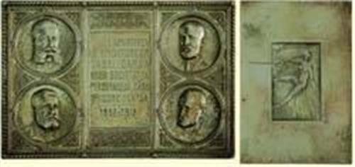 "CAPSA FAMILY COMMEMORATIVE PLAQUE". Silvered bronze plaque 1912 by Fr. Storck, 82 x 55 mm. Obv. Four busts in four medallions with members of the Capsa family, in the centre: "ÎN AMINTIREA ÎNTEMEIETORILOR CASEI CAPSA SOCIETATEA PERSONALULUI CASEI GRIGORE 1852 - 1912". Rv. The goddess Fortuna with cornucopiae. Buz. p. 260