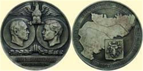 "GRATEFUL BUCOVINA EXPOSITION". Silver medal 1942 by N. V. Alexandrescu, 60 mm. Obv. Facing heads of Mihai Ist and Marshal Antonescu in two medallions, Romanian eagle with spread wings above, laurel garland, "BUCOVINA RECUNOSCATOARE" and date 6 sept. 1940 - 6 sept. 1942 below. Rv. The Bucovina map and its coat-of-arms, around "EXPOZITIA BUCOVINA REINTREGITA 6 SEPT. 1942". Buz. - Extremely rare!