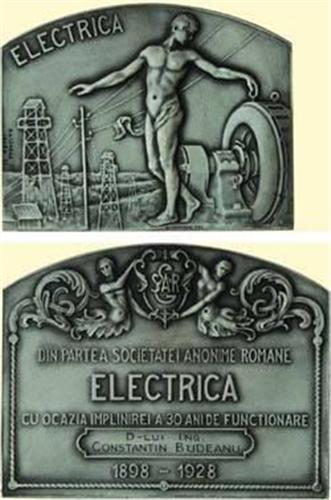 "JUBILEE MEDAL OF THE ROMANIAN ELECTRIC SOCIETY". Plaque 1928 by Jalea, S.C. Basarab F. and Huguenin, 96 x 75 mm. Obv. "ELECTRICA" in l. field young man standing next to an electric generator, electric towers with wires in field. Rv. Allegory with coat-of-rms, "DIN PARTEA SOCIETATEI ANONIME ROMANE ELECTRICA CU OCAZIA IMPLINIREI A 30 ANI DE FUNCTIONARE D-LUI ING. CONSTANTIN BUDEANU 1898 - 1928". Buz. p. 268 var.