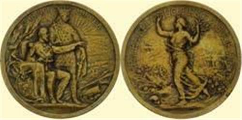 "THE PEACE OF BUCHAREST". Bronze medal 1913, by Henri Nocq - Paris, 58 mm. Obv. Carol Ist sitting on the throne, Prince Mircea the Old standing next to him; landscape in field. Rv. Peace advancing l. on a battlefield, carrying olive branch; above "PACEA DE LA BUCURESCI 28 JULIE 1913". Buz. -