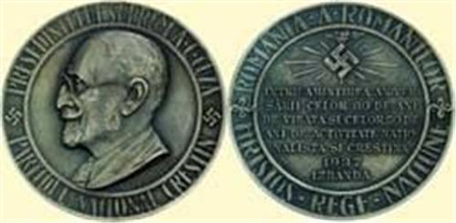 "TRIBUTE TO A. C. CUZA, PRESIDENT OF THE CHRISTIAN NATIONAL PARTY". Silver medal 1937 by F. W. Becker, 60 mm. Obv. Bust l. of A. C. Cuza, around "PRESEDINTELUI SUPREM A. C. CUZA PARTIDUL NATIONAL CRESTIN". Rv. Swastika with rays and torch, "ÎNTRU AMINTIREA CELOR 80 DE ANI DE VIEATA SI CELOR 50 DE ANI DE ACTIVITATE NATIONALISTA SI CRESTINA 1937. IZBÂNDA"; around "ROMÂNIA - ROMÂNILOR", "HRISTOS - REGE - NATIUNE". Buz. -