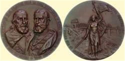 "VICTORY IN THE BALKAN WARS". Bronze medal 1913, 63 mm. Obv. Busts of Mircea the Old and Carol Ist facing three-quarters, around "MIRCEA CEL MARE DOMNUL UNGRO-VLAHIEI SI AL SILISTREI PÅNÅ LA MARE. 1386 - 1418. CAROL CEL MARE AL ROMÂNIEI 1913". Rv. Victory, facing, holding a sword and a standard, "Anghel Saligny" bridge in field, "VOESTE ªI VEI PUTEA", "DREPTUL NOSTRU". 63mm. Buz. -. Rare and beautiful medal!