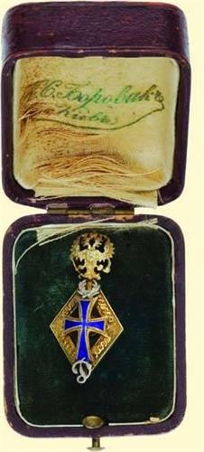 Badge of Doctors of Imperial Russian Universities; miniature badge with screw back, silver gilt, superimposed cross blue enamelled, with small "D" on lower end of cross, five parts construction, screw with small nut (with Kokoshnik), in original small box ("N.S.BOROWIK, Kiev"). Excellent old quality in best condition! (A.-W. 700, Patr.I/2.16)