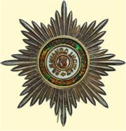 Breast Star (1st and 2nd class); silver, centre medallion gilt and enamelled, smooth rays, reverse gilt, Old Russian hallmarks ("84" Peterburg), maker's mark "Keibel", with thin tapered pin. Very fine Old Russian quality with some patina and small signs of wearing.