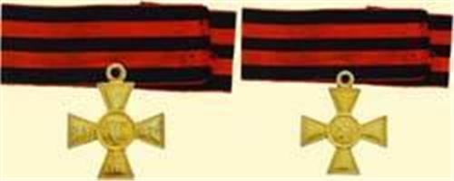 Gold Cross 2nd class - Type 1913 (1915); breast badge, gold, Old Russian Kokoshnik-mark, weight 13,6 gramme, numbered on reverse "No. 45076", with loop and long original ribbon. Small signs of wearing, testing marks.