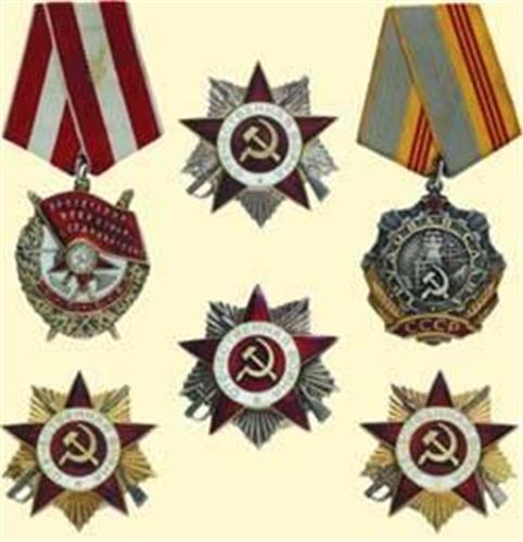 Family Group of Six; Order of the Red Banner - 2nd type, Order of the Patriotic War 1st class - 3rd type (2x), Order of the Patriotic War 2nd class - 3rd type (2x), Order of the Glory of Labour 3rd class. All silver, partially gilt, enamelled, Monetnij Dvor-marks and numbered, with original ribbon clasps resp. screws.