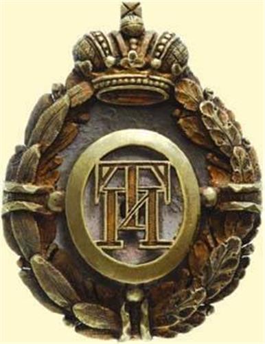 Graduation Badge of St. Peterburg Practical Technological Institute (before 1896); breast badge with screw back, silver gilt, two parts construction, Old Russian hallmarks ("84 St. Peterburg"), maker's mark ("AW" ? / in Latin letters), screw with additional disc and small nut. Very fine Old Russian solid quality with signs of wearing. (A.-W. ---, Patr.I/2.3.)